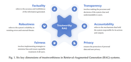 RAG系统可信度六个关键维度的定义:如图1所示,我们从六个维度定义了RAG系统的可信度:(1)真实性:通过与可靠来源进行验证,确保生成信息的准确性和真实性。(2)鲁棒性:确保系统对错误、对抗性攻击和其他外部威胁的可靠性。(3)公平性:在检索和生成阶段尽量减少偏见,确保公平的结果。(4)透明性:使RAG系统的过程和决策对用户清晰易懂,促进信任和问责。(5)问责性:实施机制,确保系统的行为和输出负有责任且可追溯。(6)隐私性:在检索和生成过程中保护个人数据和用户隐私。