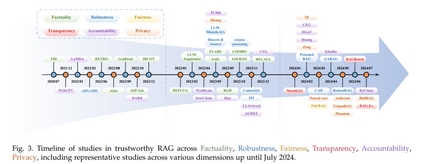一个完整的RAG系统包括三个主要阶段:将外部知识注入生成器,生成器生成答案,以及对生成的答案进行评估。每个阶段都面临与可信性相关的挑战。在外部知识注入阶段,存在注入噪声或私人信息的风险。在答案生成阶段,引入的外部知识可能导致偏见推理,并破坏通过人类反馈强化学习(RLHF)所实现的一致性。最后,在答案评估阶段,生成的答案可能包含事实错误或缺乏足够的外部知识依据。 如图2所示,我们确定了RAG系统可信性的六个关键维度:鲁棒性、公平性、真实性、隐私性、透明性和问责性。对于每个维度,我们将探讨以下几个方面:适用于LLM的一般定义、RAG背景下的具体定义以及详尽的文献回顾。为了更清楚地对相关研究进行分类和总结,我们首先在图3中展示了这些研究的时间线,以确定该领域的趋势。然后,在表1中,我们根据三个标准对每项研究进行了分类:可信性维度、方法类型和对象。以下章节将深入探讨每个可信性维度的细节。