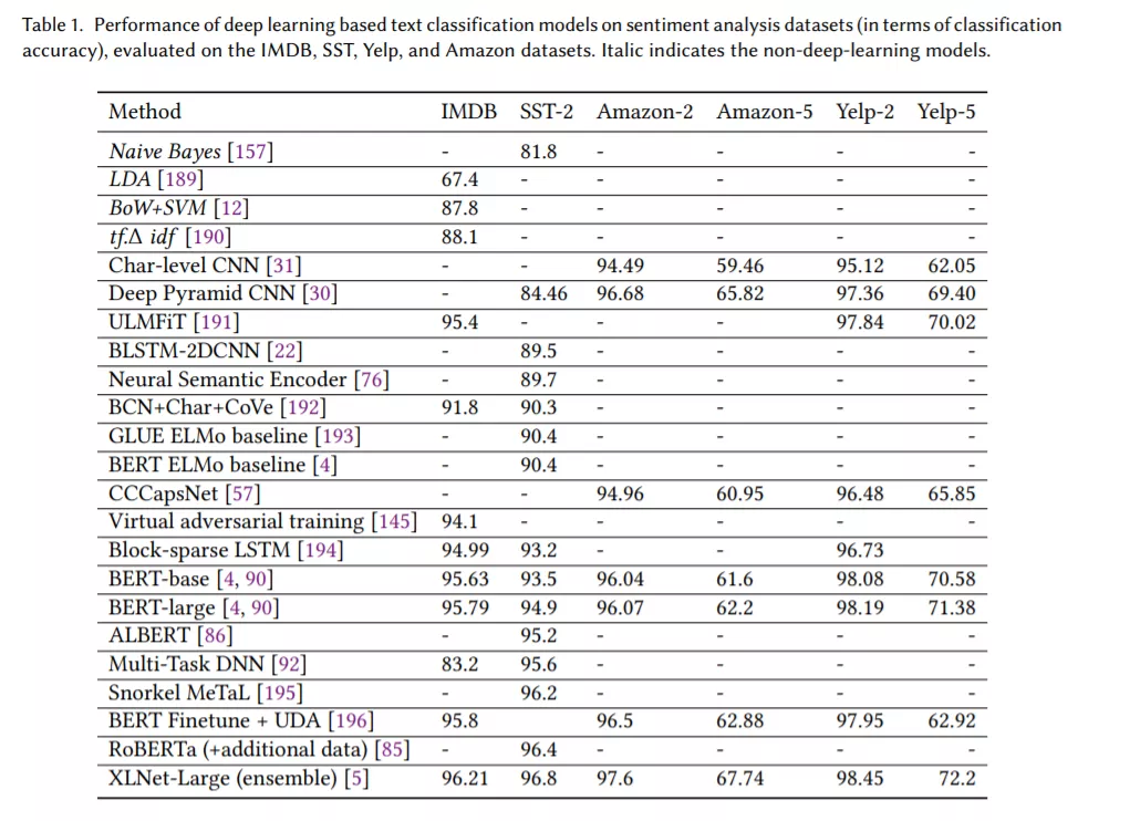 在2012年,一种基于深度学习的模型AlexNet (AlexNet,)在ImageNet竞赛中获得了巨大的优势。从那时起,深度学习模型被应用到计算机视觉和NLP的广泛任务中,提高了技术水平(vaswani2017attention; he2016deep, devlin2018bert ;yang2019xlnet, )。这些模型尝试以端到端方式学习特征表示并执行分类(或回归)。它们不仅能够发现数据中隐藏的模式,而且更容易从一个应用程序转移到另一个应用程序。毫不奇怪,这些模型正在成为近年来各种文本分类任务的主流框架。