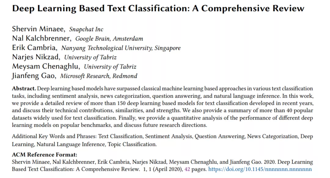【导读】文本分类是自然语言处理汇总的基础性任务,伴随机器学习尤其是深度学习模型的发展,文本分类算法也在革新换代。最近,来自Snapchat、Google、NTU、Tabriz、微软等学者发表了关于《深度学习文本分类》的综述论文,42页pdf215篇参考文献,详细回顾了近年来发展起来的150多个基于深度学习的文本分类模型,并讨论了它们的技术贡献、相似性和优点。我们还提供了40多个广泛用于文本分类的流行数据集的摘要。