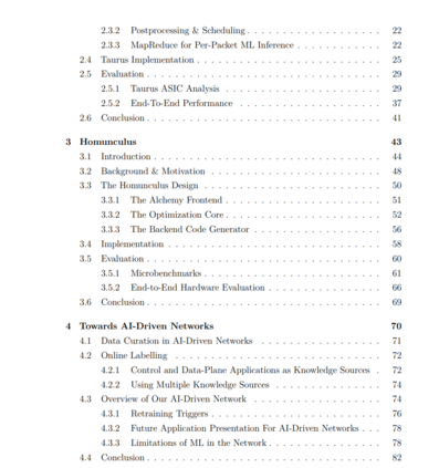 网络管理对于研究人员和行业来说越来越难以应对。网络的规模和复杂性正在迅速增长。它们现在必须满足比以往任何时候都更大的应用集和更大的用户群,同时还要遵守越来越严格的性能要求。面对运行网络的众多挑战,运营商必须超越手动调优算法的时代,转而采用更自动化的方法——即 AI 驱动的网络。在寻找更多功能的网络工具时,许多研究人员已将机器学习(ML)视为网络系统中的数据驱动、自适应机制的工具。然而,一些实际问题困扰着这样的发展。我们能否在数据包路径中运行 ML?运营商必须手动构建每个新的 ML 模型吗?我们如何纳入新的数据?在这篇论文中,我们展示了构建 AI 驱动网络所需的关键组件的构建。我们首先描述了 Taurus 的设计,这是一个平台,使数据平面 ML 能够以每个数据包的粒度,在线速率上运行在网络的数据包路径中。此外,我们证明了 Taurus 的硬件添加的开销最小——在我们的原型中,芯片面积不到 4%,功耗不到 3%。接下来,我们讨论了 Homunculus,这是一个针对数据平面 ML 平台(如 Taurus)的编译器堆栈,它允许自动生成符合资源和性能要求的 ML 模型,这些模型在我们的测试中比手动调整的模型性能提高了高达 16.9%。最后,我们展示了如何组装这些工具以在网络中启用自适应的 ML 循环。网络中的原始数据的在线标注可以为 Homunculus 提供数据,使网络能够从其自身的数据包数据中构建新的 ML 模型。这些模型可以在 Taurus 中部署学习到的策略,为即将出现的 AI 驱动的网络奠定基础。