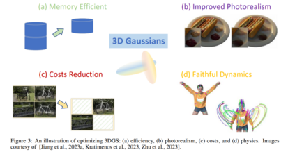 高斯内在属性优化尽管3D高斯喷溅的能力和效率已经得到展示,但在以下有希望的方向上仍有进一步精细化的空间(如图3所示):(a)使3D-GS更加内存高效对于实时渲染至关重要;(b)渲染图像的质量可以进一步提高;(c)减少合成新视角图像的成本;(d)使3D高斯能够以忠实的动态表示动态场景。