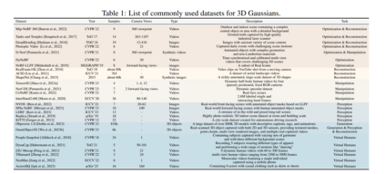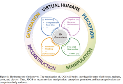 3D 高斯喷溅(3D-GS)作为计算机图形学领域中的一项突出技术,特别是在3D渲染的背景下已经显现出来[Kerbl et al., 2023, Lu et al., 2023, Yu et al., 2023a]。3D-GS提供了一种多功能且强大的方法,用于高效渲染具有高级别细节的复杂场景[Wu et al., 2023a, Cotton and Peyton, 2024]。通过将对象和表面表示为高斯集合,高斯喷溅允许对几何形状和外观属性进行高效和准确的表示[Guédon and Lepetit, 2023, Yu et al., 2023a]。3D-GS克服了体积渲染方法的局限性,提供了更加灵活和适应性的3D对象表示方式[Kerbl et al., 2023]。此外,高斯喷溅使得各种视觉效果如景深和柔和阴影的真实渲染成为可能,使其成为计算机图形学研究和应用中的宝贵工具[Chung et al., 2023a]。本文的主要贡献是提供3D 高斯喷溅的全面概述,探索其背后的进步和应用。通过对现有文献的广泛回顾,我们旨在呈现3D 高斯喷溅中使用的技术和算法的详细分析,包括高斯生成、重构、操作、感知和人类应用的机制。除了调研3D-GS的当前最先进水平,本文还旨在突出该领域的挑战和未解决的研究问题。我们将深入探讨处理大规模场景的高效数据结构、实时渲染的优化技术以及3D-GS与其他渲染算法的集成等话题。此外,我们将讨论3D-GS的各种应用,从机器人技术到自主导航。通过识别这些研究差距,我们希望激发未来的工作并促进3D 高斯分割领域的进步。