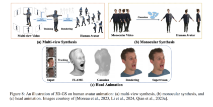 通常,基于3D高斯的方法从使用SMPL模板初始化高斯开始,然后使用线性混合蒙皮(LBS)将表示变形到观察空间。然后通过多视图(图8a)或单眼视频(图8b)渲染和监督高斯。此外,一些方法专门在重建人类头部头像(图8c),而一些则专注于通用管道而非针对个体的优化。