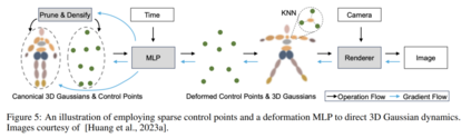 使用像NeRF和SDF这样的隐式神经表示学习虚拟人类头像,因为长时间的优化和渲染时间以及生成满意质量的新体姿势的挑战而苦苦挣扎。相比之下,利用3D高斯表示的方法实验性地证明可以提高训练和渲染速度,并提供对人体变形的显式控制。此外,3D高斯方法中的前向蒙皮避免了在神经隐式表示中使用的逆向蒙皮中存在的对应模糊性[Jena et al., 2023]。