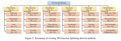 3D高斯溅射在计算机图形学和计算机视觉领域展示了显著的潜力。然而,由于3D高斯溅射相关的复杂结构和多样化任务,各种挑战依然存在。本节旨在解决这些挑战,并提出未来研究的潜在途径。本文提供了关于3D高斯溅射的全面且最新的综述,总结了现有的方法及其应用。我们首先回顾了专注于优化3D-GS以提高效率、真实感、成本和物理性能的论文。随后,我们系统地探索了3D-GS的五个主要应用,包括重建、操作、生成、感知和以人为中心的应用。最后,我们深入讨论了这一领域的挑战和潜在的未来发展方向。此外,我们提供了方法的比较总结,为3D视觉和计算机图形学的研究者提供了宝贵的资源。