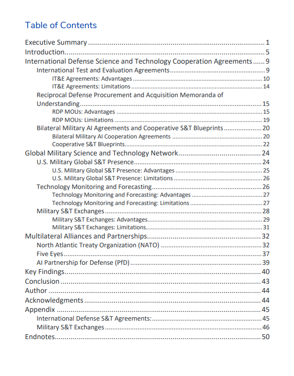 在此背景下,本报告重点关注通过基于可互操作部队和尖端技术的强大军事关系,维护美国及其伙伴和盟国网络相对于潜在对手的优势的必要性。国防部已经拥有多种工具可用于深化与其盟国和国际安全伙伴的科技(S&T)合作。但为了充分利用它们在人工智能方面的潜力,该部门需要重新设想并更好地整合它们。