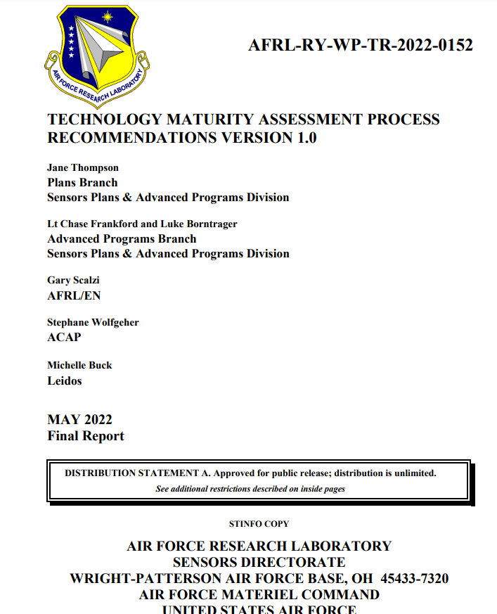 科学家和潜在的过渡伙伴之间的讨论往往不能准确地确定一项技术的成熟度、潜在的军事用途,以及一项技术的合理和可靠的使用时间表。在 "技术拉动 "和 "技术推动 "的情况下,对技术成熟度的准确描述是必要的,以告知科技领导层和潜在过渡伙伴开发的进展。成熟度,通常被称为技术准备水平(TRL),是一个时间快照,它描述了演示或测试环境的特点,在该环境下,一项特定的技术被成功地测试。美国国防部(DoD)对TRL有一个标准的定义,从1到9,范围从基本原理到实际任务操作中证明的实际系统。 从历史上看,官方的TRL评估只在正式的采购过程中被系统地分配,然而,在AFRL项目开发的各个层面,通常都会要求进行技术成熟度评估。