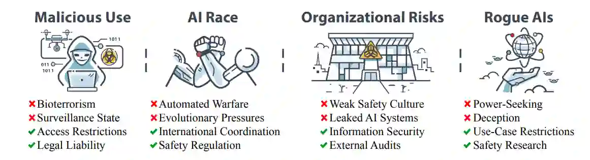 人工智能(AI)的快速发展引发了专家、政策制定者和世界领导人对日益先进的人工智能系统可能带来灾难性风险的日益担忧。虽然许多风险已被单独详述,但目前迫切需要对潜在危险进行系统的讨论和说明,以便更好地为减轻这些危险提供信息。本文概述了人工智能灾难性风险的主要来源,将其分为四类:恶意使用,即个人或团体故意使用人工智能造成伤害;人工智能竞赛,即竞争环境迫使行为者部署不安全的人工智能或将控制权让给人工智能;组织风险,强调人为因素和复杂系统如何增加灾难性事故的几率;流氓人工智能,描述控制远比人类智能的代理固有的困难。对于每一类风险,我们都描述了具体的危害,介绍了说明性故事,设想了理想场景,并提出了减轻这些危险的实用建议。我们的目标是促进对这些风险的全面了解,并激发集体的积极努力,确保以安全的方式开发和部署人工智能。最终,我们希望这将使我们能够实现这一强大技术的益处,同时将灾难性后果的可能性降至最低。