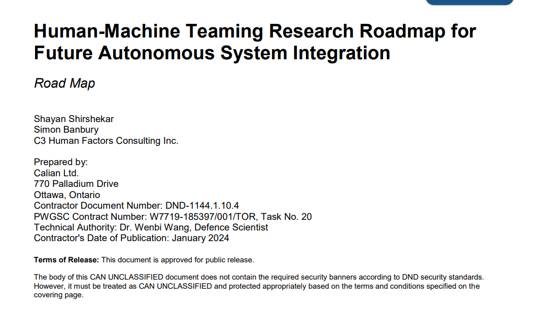 这项工作由 Calian 和 C3 人因咨询公司根据加拿大国防研究与发展-多伦多研究中心(DRDC TRC)任务 20 "未来自主系统集成的人机协作研究路线图 "进行,是更大的人机交互(HAI)任务授权合同(TAC;合同:W7719- 185397/001/TOR)的一部分。人机交互任务授权合同的总体目标是设计、开发、实施和评估人机协作(HAT)概念、方法和技术,以提高加拿大武装部队(CAF)人机系统(HMS)的整体性能。