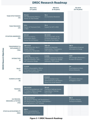 本报告介绍了一项研究的结果,其目的是根据目前从事人机协作研究的 DRDC 成员的研究要求,制定一个研究路线图,以指导 DRDC 未来的研发活动,解决自主系统集成中的人机协作问题。研究路线图的结构基于美国国家科学院、工程院和医学院的 BOHSI 委员会的研究成果,该委员会为 HAT 研究确定了 10 个独特目标和 46 个研究课题。研究路线图说明了 DRDC 研究人员、其利益相关者(DND)和研究界(如 BOHSI 所述)之间的一致程度。这项研究的成果包括一个时间表,概述了 DRDC 的研究重点以及尚未确定优先次序的领域。