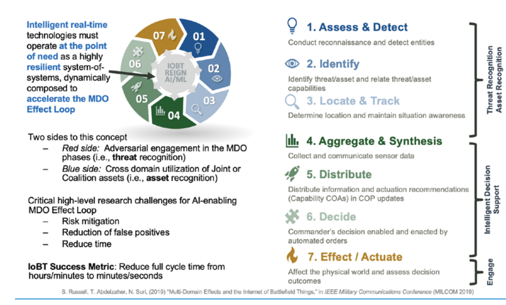 将多个领域的军事能力融合以提高效能的学说预示着国防的新时代,其特点是能够承受更高的作战规模和节奏,这得益于战场自动化和协作水平的提高。然而,要获得这些技术进步的潜在好处,前提是要找到应对无数挑战的成功解决方案,以便在竞争环境中实现智能、异构、交互资源的更高效和可扩展的操作。换句话说,提高防御能力的自动化和协作需要更智能的“战场操作系统”——一个在排除人类参与时间尺度上管理复杂自动化任务的系统,同时赋予作战人员足够的控制权。我们将此操作系统称为战场物联网 (IoBT)。