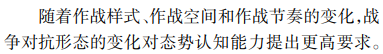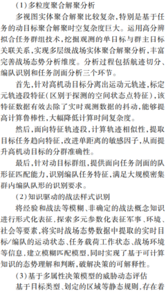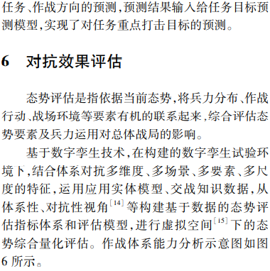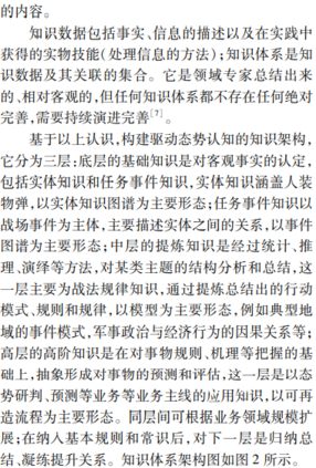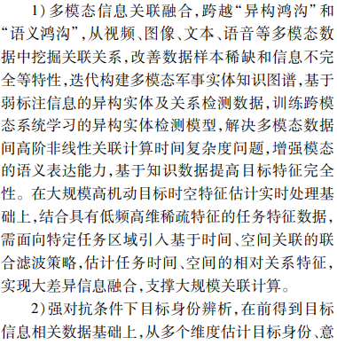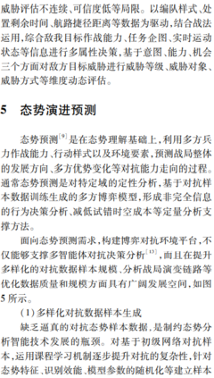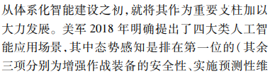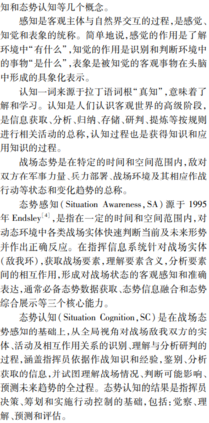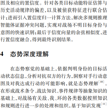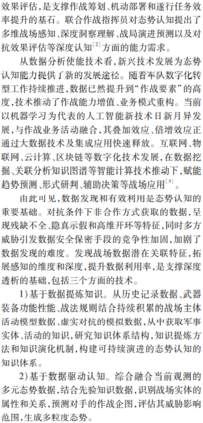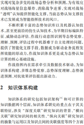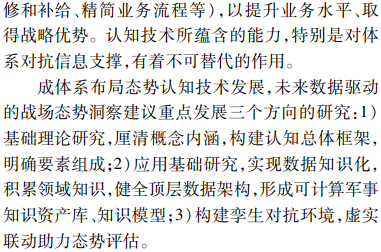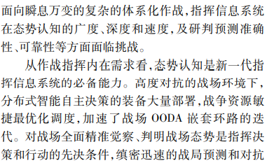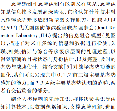 **首先由态势处理技术发展的历程,深入辨析了感知和认知技术内涵;然后面向实体、活动及相互作用关系的识别、理解与分析研判的能力需求,以体系对抗的视角提出了态势觉察、态势理解、态势预测和态势评估4个循环迭代的态势认知核心处理环节;**最后结合认知计算技术发展,分析了数据驱动下态势认知4个环节未来技术发展的脉络、重难要点,并给出了该领域技术路线选择的思考。