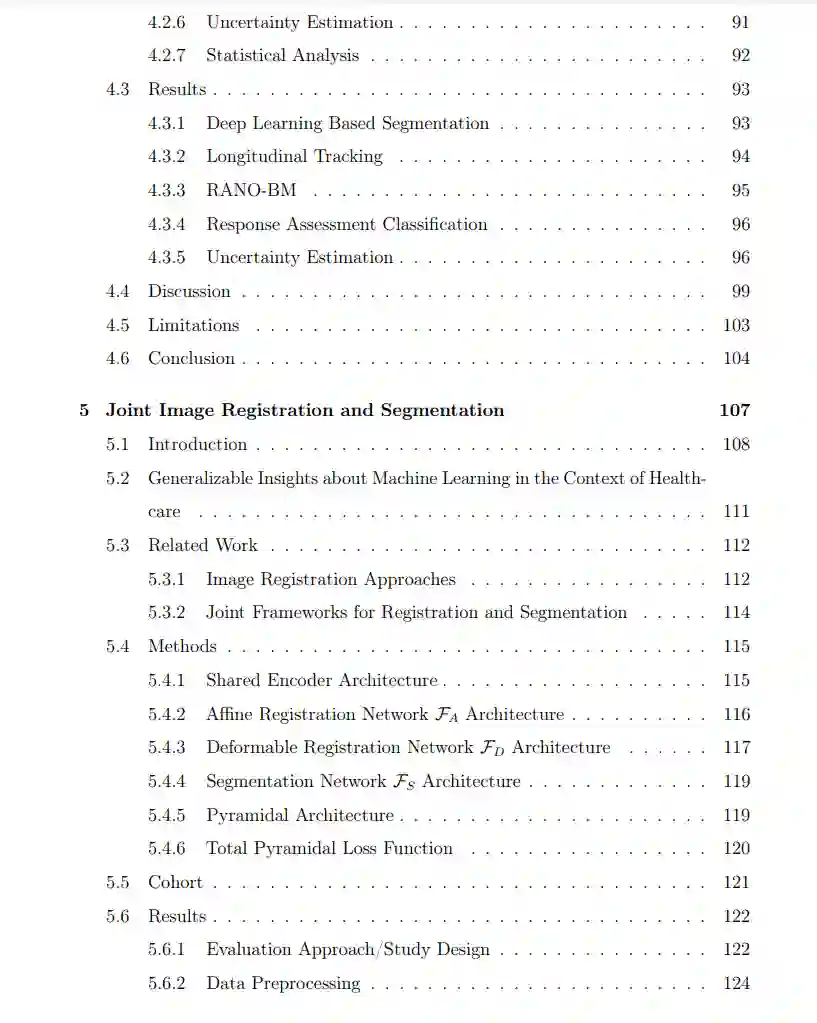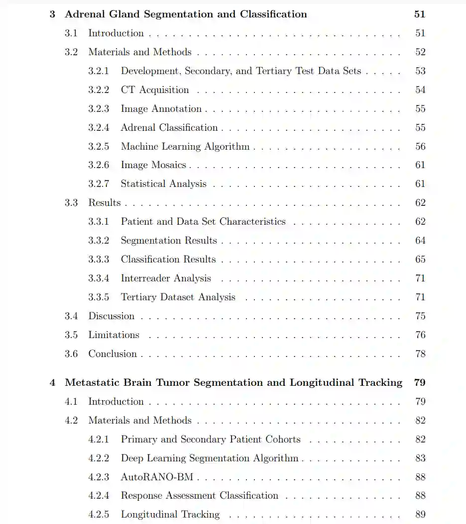 临床工作流程中最重要的步骤之一是医学图像的分割,它可用于多种临床决策任务,如疾病诊断和治疗反应评估。由临床专家手工分割的3D医学图像(如计算机断层扫描(CT)或磁共振成像(MRI))可能耗时过多,不适用于常规的临床工作流程,并且更容易受到人为错误和不一致性的影响。近年来,基于深度学习(DL)的方法在多种计算机视觉任务中展现出了与人类相当的性能,使它们成为研究者旨在自动化医学图像分割的有吸引力的选择。本论文考虑了两种医学成像场景,并研究了通过DL进行全自动图像分割如何增强下游的临床任务。第一个场景评估了用CT诊断偶然发现的肾上腺团块的临床工作流程。尽管有标准化的报告系统和严格的肾上腺团块定义指南,但此任务仍存在显著的评估者间变异性。为了实现肾上腺的客观和可重复的表征,本论文开发了第一个用于CT上的分割和分类的DL方法。使用大规模的回顾性数据集,此方法用于识别放射科医生可能遗漏的检测,并讨论了此事的临床意义。第二个场景关注了MRI上转移性脑肿瘤患者的治疗反应评估。由于患者可能有大量的转移灶,标准的放射学分析只追踪少数目标病变来评估治疗的效果。在这种范式下,由于缺乏定量强调,较小的非目标病变可能被忽视甚至遗漏。为此,开发了一个流程,自动分割MRI上的脑肿瘤转移病变并输出标准的反应评估指标。由于转移性脑瘤患者可用的纵向成像数据的普遍性,制定了一个次要模型,通过利用已知的先前时间点信息,来提高微转移病变的检测和分割。