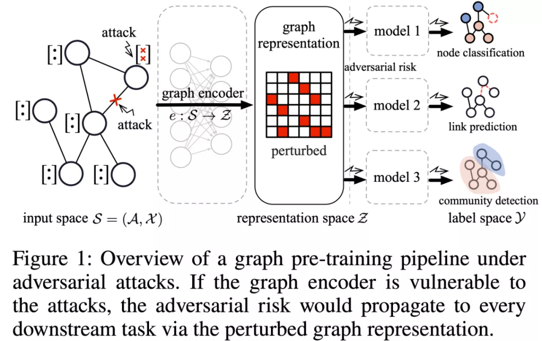 无监督/自监督的图预训练模型近几年受到了众多关注,并且可以推广到各种不同的下游应用中。然而,图预训练模型的对抗鲁棒性仍未被探索。并且,大多现有研究只考虑了有监督学习下端到端图模型的鲁棒性,它们对标签信息的依赖在很大程度上限制了应用范围和可用性。例如,在没有标签的下游任务(如社交网络中的社区识别任务)中,这些模型往往表现不佳。此外,针对不同的下游任务训练多个图模型不但成本较高而且很不安全。相对而言,如图1所示,在无监督的图预训练框架中,我们只需要一个鲁棒的图编码器就能够有效防止对抗风险传播到下游任务中,并且图编码器学习得到的鲁棒图表征可以适用于不同的下游应用中,比如节点分类、链接预测和社区识别等。