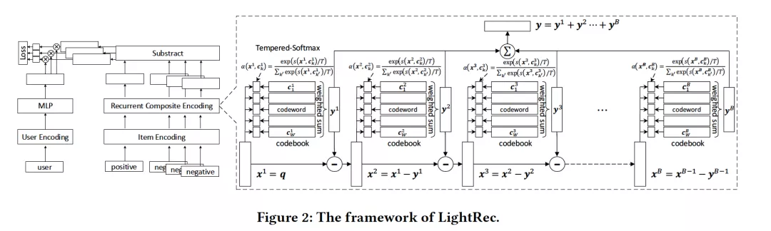 摘要:近年来,深度推荐系统已经取得了显着的进步。尽管具有出色的排名精度,但实际上运行效率和内存消耗在现实中却是严重的瓶颈。为了克服这两个瓶颈,我们提出了LightRec,这是一个轻量级的推荐系统,具有快速的在线推断功能和经济的内存消耗。LightRec的主干是总共B个codebooks,每个codebook均由W个潜在向量组成,称为codewords。在这种结构的顶部,LightRec将有一个商品表示为B codewords的加法组合,这些B codewords是从每个codebook中选择的最佳的。为了有效地从数据中学习codebooks,我们设计了一个端到端的学习工作流程,其中所提出的技术克服了固有差异性和多样性方面的挑战。另外,为了进一步提高表示质量,采用了几种distillation策略,可以更好地保留用户-商品的相关性得分和相对排名顺序。我们对LightRec在四个真实数据集上进行了广泛评估,得出了两个经验发现:1)与最先进的轻量级baseline相比,LightRec在召回性能方面取得了超过11%的相对改进;2)与传统推荐算法相比,在top-k推荐算法中,LightRec的精度下降幅度可以忽略不计,但速度提高了27倍以上。