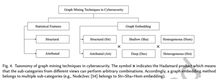 根据网络安全中使用的图挖掘技术,我们将现有的方法分为两大类。(1) 统计特征。这类方法基于人工构建的高维稀疏统计特征。根据是否利用图的属性信息,统计特征进一步分为结构特征和属性特征。(2) 图嵌入。与统计特征不同,图嵌入将特征向量从稀疏转换为密集,并自动保留结构和属性信息。我们从三个角度给出了图挖掘方法的分类:结构/属性(是否使用属性信息)、浅层/深层(是否使用深度学习)和同构/异构(是否关注异构图)。这些分类法可以从全面的角度关联不同网络安全任务的特征。例如,一些网络安全任务(如僵尸网络检测)对结构特征敏感,而其他任务(如欺诈检测)则更关注属性信息;恶意软件分析,地下市场分析通常在异构图上进行,函数调用关系通常被构造为同构图。图4给出了网络安全中使用的图挖掘技术的详细分类。