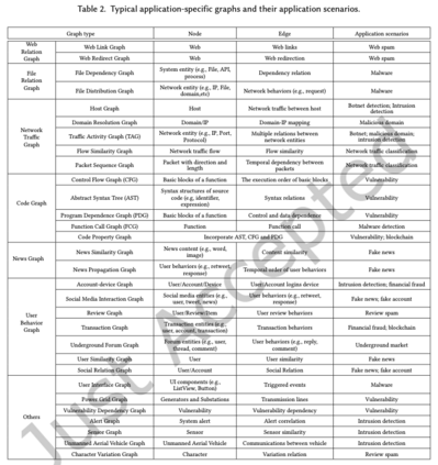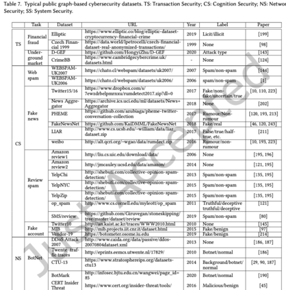 本综述也总结了图挖掘用于网络安全的开源数据集(表7(部分))和工具包。图挖掘工具包包括PYG,CogDL,DGL,OpenHGNN,GammaGL等。网络安全数据收集工具包括Twitter Search API,Snopes,VirusTotal等。