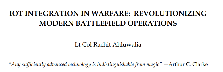 长期以来,国防领域一直是众多新兴技术的源泉。获得战场优势一直是探索和尝试激进想法的驱动因素。第一次海湾战争后,时任美国海军作战司令的威廉-欧文斯上将在美国国家安全研究所发表的一篇研究文章中提出了 “系统簇”这一概念,从而使这种想法开始成形。他阐述了数据和网络改变作战的方式。这一观点转化为 “网络中心战”概念,它是三个领域的融合,即物理领域(进行演习并从传感器获取数据)、信息领域(传输和存档数据)和认知领域(处理和分析数据)。在这一概念提出二十多年后的今天,世界各地的军事领导人和国防专家都对这一概念的实施持乐观态度,这主要是由于物联网技术的成熟。乌克兰地面部队广泛使用标枪反坦克导弹和 “弹簧刀 ”隐形导弹来挑战强大的俄罗斯装甲部队,这就是物联网技术在战区成功应用的例证。