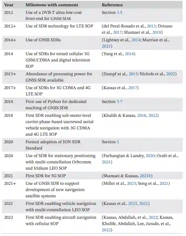 随着技术的进一步发展,出现了新的全球导航卫星系统软件无线电,ION SDR 标准的一些缺陷也逐渐显现出来(Clements 等人,2021 年)。这些情况促成了本文的诞生,本文的贡献主要体现在四个方面。首先,本文首次介绍了 GNSS SDR 的发展历史(第 2 节)。其次,本文详细介绍了部分 GNSS SDR(第 3 节)。第三,概述最近的前端开发(第 4 节)。最后,报告总结了 ION SDR 标准的历史,并提出了更新建议(第 5 节)。