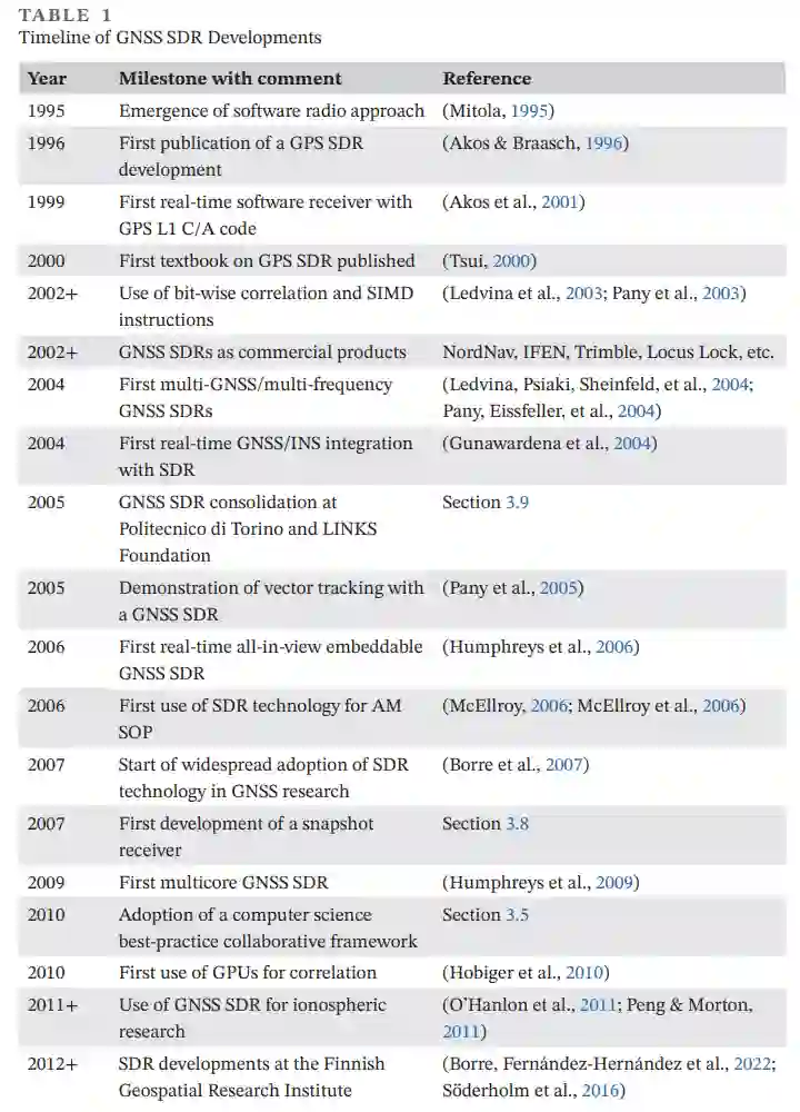 本报告以全球导航卫星系统(GNSS)软件定义无线电(SDR)工作组在过去十年中开展的工作为种子,首次总结了 GNSS SDR 的发展历史。本报告重点介绍了部分向公众公开的或影响 SDR 总体发展的 SDR 实施情况和成就。报告讨论了与中频样本数据和元数据标准化过程有关的方面,并提出了更新导航学会 SDR 标准的建议。这项工作的重点是在通用处理器中实现全球导航卫星系统 SDR,而不涉及在现场可编程门阵列和特定应用集成电路平台上进行的开发。数据收集系统(即前端)对于 GNSS SDR 一直都是至关重要的,因此本工作也涵盖了部分内容。本报告仅代表作者的知识,并非对 SDR 历史的完整描述。
