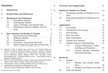 气候变化描述了全球温度和天气模式在长期内的显著变化。目前,我们的星球正经历着极端自然现象的激增,如干旱[1]、[2],洪水[1],地震[3],热浪[4]和强降雨[5],这些现象由不断加剧的气候变化所推动。加剧这些挑战的是全球变暖和海平面下降对生态系统的惊人威胁[6]、[7]。鉴于本世纪预计的地表温度增加,我们预见这些极端现象的严重程度和频率将加剧[8]。 利用先进的气候建模和预测技术,这些技术集成了大量的大气和地表变量 - 包括大气状况、洋流、陆地生态系统和生物圈相互作用 - 可以增强我们对气候变化的理解[9]、[10]。这些见解可以指导定制缓解策略的制定[11]。长期准确的海平面变化预测可以加强沿海城市的城市规划和灾害准备工作[12]、[13]、[14]。短期内,降雨、温度和湿度的精确预测可以提高包括农业规划和交通调度在内的人类活动的安全性[15]、[16]、[17]。 传统上,一般环流模型(GCMs)[18]和数值天气预报模型(NWPs)[19]、[20]、[21]一直是研究气候变化趋势和预测未来天气和气候情景的首选工具。这些模型融合了主要的地球系统组成部分,包括大气、地表和海洋,以模拟地球系统的多维动态。它们通过复杂的物理方程式,如大气动力学,确定这些组成部分之间的潜在非线性关系,以在广泛的物理参数范围内生成预测[22]。然而,尽管它们已经相当成熟,数值受限的天气预报模型仍面临许多挑战和限制。其中之一是它们对地方地理特征的过于简化的表现[23],因为它们通常无法捕捉到对区域天气和气候模式产生关键影响的地方地形的复杂细节。另一个障碍是有效地整合来自不同来源的观测数据,如气象站、雷达和卫星[8]。传统模型通常难以将这些具有不同空间和时间分辨率的数据纳入其建模框架。此外,它们需要大量的计算资源来管理众多的物理限制[24]。地球系统的复杂性和规模要求进行大量的计算,给计算能力和效率带来挑战。 人工智能技术的快速发展为天气和气候建模引入了成本效益高、直接且简化的解决策略。特别是,机器学习(ML)和深度学习(DL)技术可以识别天气和气候数据中的潜在趋势表示,从而绕过对复杂物理关系的需求。最初,鉴于ML技术相较于大规模、长时间的物理模型的有限能力,它们被少量用于短期、局部的天气和气候条件预测。然而,过去十年目睹了数据驱动深度学习方法在天气和气候研究中的应用呈指数级增长,这得益于全球天气和气候数据的爆炸性扩展[25]、[26]。依托丰富的数据资源和计算技术的进步[27]、[28],这些模型正在革命性地改变气候科学[29]。利用大量数据,深度学习模型揭示了隐藏在气候变量中的复杂非线性关系,从而以更高的精确度捕捉气候系统的动态性和复杂性[30]、[31]。然而,这些模型通常为特定任务而设计,并使用特定格式的数据进行训练,如区域天气预测或微观尺度的降尺度。训练数据来源的表现方式差异导致了数据驱动深度学习模型在理解天气和气候数据方面的过度分化功能。因此,开发能够微调以模拟全球天气和气候系统的通用气候模型成为一个重大挑战。