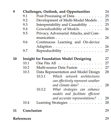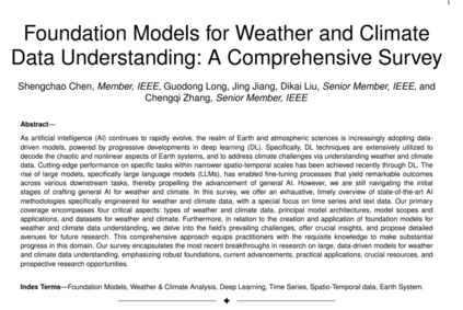 蓬勃发展的基础模型在NLP [47]、[82]、[200]和CV [45]、[46]领域已激发了对天气和气候数据理解基础模型的研究兴趣。通过预训练策略创建的大型基础模型可以显著提高基于AI的气候模型的泛化能力,并可以针对特定的下游任务进行微调。这类模型的预训练需要大规模序列数据,这不是通常从普通时间序列数据中获取的。 考虑到计算效率和对及时气候预测的需求,Pathak等人提出了FOURCASTNET [136],这是一种基于视觉变换器和自适应傅里叶神经网络运算符(AFNO)[201]的气候预训练基础模型,用于高分辨率预测和快速推理。其训练过程包括基于预训练模型的自监着预训练和自回归微调。PANGU-WEATHER [63],一个利用3D地球特定变换器的数据驱动模型,以其快速、精确的全球预测和卓越性能而闻名。它根据当前状态预测随时间变化的大气状态,当前状态由上空五个变量和四个地表变量在0.25°水平网格上的13个垂直层描述。另一方面,CLIMAX [25] 通过其基于变换器的完全监督预训练,将基础建模概念引入天气预测。它提出变量消歧和变量聚合策略,用于合并和揭示不同天气变化在不同高度的潜在关系,为适应包括全球/区域/季节性预测、气候绘制和降尺度任务在内的多样化下游任务提供了有希望的灵活性。FENGWU [138] 以独特设计的深度学习架构从多模态、多任务角度解决中期预测问题。它具有模型特定的解码器和跨模态融合变换器,在不确定性损失的监督下,以区域适应的方式平衡不同预测器的优化。鉴于上述大型模型是通过完全监督的方式训练的,W-MAE [64] 使用基于掩码自动编码器(MAE)[202]、[203]的方法,实施天气预测模型的无监督训练,这可以通过各种数据源微调用于下游任务。MetePFL [24] 和 FedWing [154] 还提出了基于提示的联邦学习[204],用于训练大型基础模型,大大降低了跨区域协作模型训练的成本,同时保护数据隐私。LLMs的快速发展导致处理天气和气候任务不再局限于视觉或时间序列模型。基于LLMs的OCEANGPT [197] 提出了处理广泛海洋相关任务的方法论。除了用于预测和模拟的基础模型之外,CLIMATEBERT [195] 是一种用于处理气候相关文本的基于NLP的基础模型。它在新闻文章、研究论文和公司气候报告等多种来源的200多万段气候相关段落上进行训练[205]。 结论