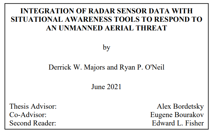 探测无人机系统(UAS)非常复杂。在多个领域(空中、陆地和海洋)整合和共享雷达信息是一个难题。目前有关无人机系统探测的研究主要集中在探测地面兵力和国家关键基础设施上空的无人机系统,但当无人机系统开始挑战港口或公海上的军舰时会发生什么?在多机构危机事件中,如何通过无线方式收集和共享信息?探测到的无人机传感器数据能否通过无线网格网络(WMN)与其他机构共享?研究表明,在一次小规模的多机构危机响应演习中,可以将 SAAB 的 G1X 雷达系统的模拟数据与战术突击套件(TAK)态势感知应用程序集成在一起。该技术运行完美;但是,注意到,必须进一步检查和改进反无人机系统战术技术和程序(TTP)、国际无人机系统法律法规以及提示和自动化,以适应当今的战斗和机构间响应。此外,发现在演习期间,手机信号无法有效覆盖旧金山湾。为了缩小这一差距,使用 Persistent Systems 公司的 MPU-5 无线电设备成功扩展了 WMN,从而在非网络环境中创造了更广泛的维护网络功能的能力。