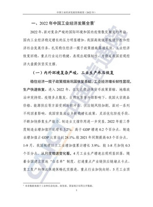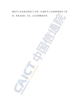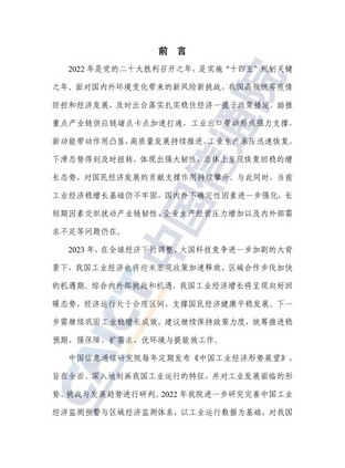 2023年,在全球经济下行调整、大国科技竞争进一步加剧的大背景下,我国工业经济也将迎来宏观政策加速释放、区域合作步伐加快的机遇期。综合内外部挑战和机遇,我国工业经济增长将呈现向好回暖态势,经济运行处于合理区间,支撑国民经济健康平稳发展。下一步需继续巩固工业稳增长成效,建议继续保持政策力度,统筹推进稳预期、强保障、扩需求、优环境与提能效工作。 中国信息通信研究院每年定期发布《中国工业经济形势展望》,旨在全面、深入地刻画我国工业运行的特征,并对工业发展面临的形势、挑战与发展趋势进行研判。2022年我院进一步研究完善中国工业经济监测预警与区域经济监测体系,以工业运行数据为基础,对我国2022年工业发展全景进行了分析,对2023年工业发展形势进行了预判,希望为政府、行业、企业决策提供参考。