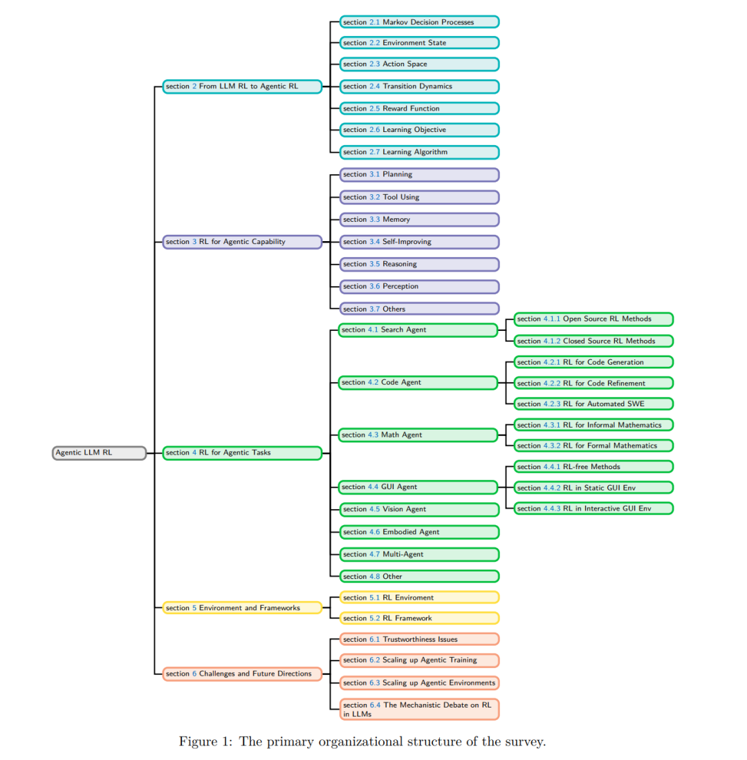 本文的组织结构旨在从概念基础逐步构建对 Agentic RL 的统一理解,并延伸至实际系统实现。第 2 节从 MDP/POMDP 视角形式化刻画向 Agentic RL 的范式转变;第 3 节从能力维度分析 Agentic RL,对规划、推理、工具使用、记忆、自我改进、感知等关键模块进行分类;第 4 节探讨其在搜索、GUI 操作、代码生成、数学推理与多智能体系统等领域的应用;第 5 节整合支撑实验与基准评测的开源环境与强化学习框架;第 6 节讨论开放挑战与未来研究方向;第 7 节对全文进行总结。整体结构如图 1 所示。