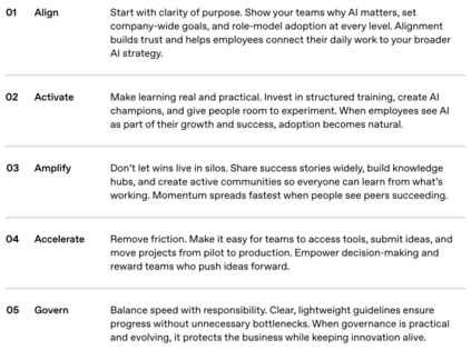 纵观整个报告,OpenAI 并非将 AI 视为一种辅助的工具,而是将其视为组织运作方式全面变革的基础。