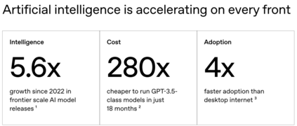 自 2022 年以来,前沿大规模 AI 模型的发布数量增加了 5.6 倍; * 仅仅 18 个月,运行 GPT-3.5 等级的模型的成本就降低了 280 倍; * AI 的采用速度比桌面互联网快 4 倍。