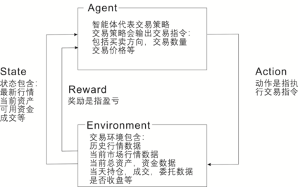 目前,深度强化学习(DRL)技术在游戏等领域已经取得了巨大的成功,同时在量化投资中的也取得了突破性进展,为了训练一个实用的DRL 交易agent,决定在哪里交易,以什么价格交易以及交易的数量,这是一个具有挑战性的问题,那么强化学习到底如何与量化交易进行结合呢?下图是一张强化学习在量化交易中的建模图: