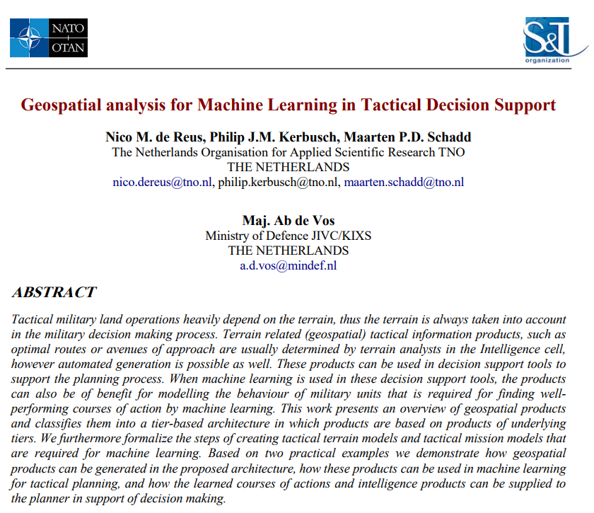 战术军事陆地行动严重依赖地形,因此在军事决策过程中始终需要考虑地形。地形相关(地理空间)战术信息产品,例如最佳路线或近场途径通常由情报单元中的地形分析师确定,但也可以自动生成。这些产品可用于决策支持工具,以支持规划过程。当在这些决策支持工具中使用机器学习时,这些产品还有助于对军事单位的行为进行建模,这是通过机器学习找到表现良好的行动方案所需的。这项工作概述了地理空间产品,并将它们分类为基于层的体系结构,其中产品基于底层的产品。我们进一步规范了创建机器学习所需的战术地形模型和战术任务模型的步骤。基于两个实际示例,我们演示了如何在提出的架构中生成地理空间产品,这些产品如何用于机器学习以进行战术规划,以及如何将学习到的行动和情报产品提供给规划者以支持决策。