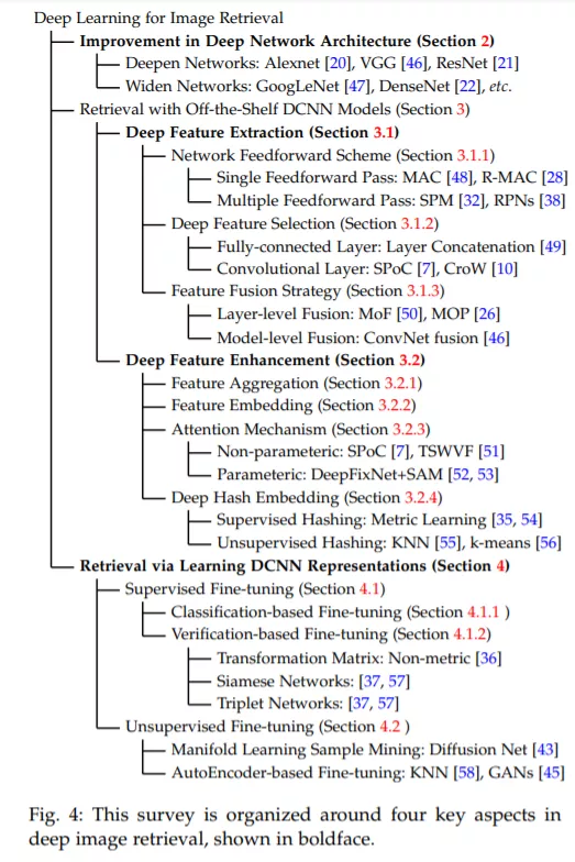 最近在改进图像检索方面的进展可以分为网络级和特征级两类,图4给出了详细的分类。这项综述大致包括以下四个范畴: