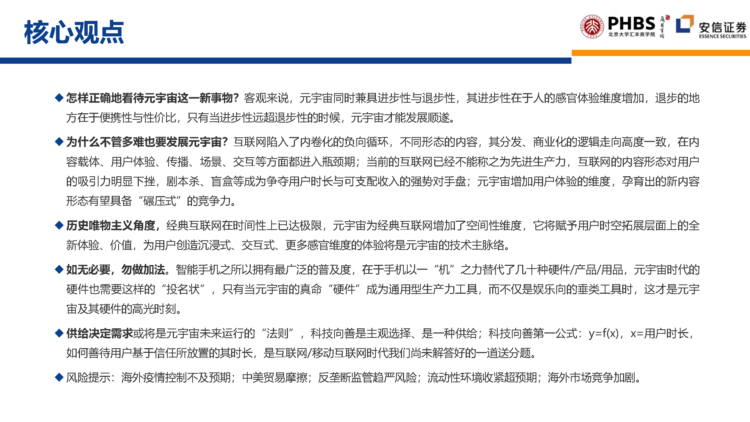 ◆ 供给决定需求或将是元宇宙未来运行的“法则”,科技向善是主观选择、是一种供给;科技向善第一公式:y=f(x),x=用户时长,如何善待用户基于信任所放置的其时长,是互联网/移动互联网时代我们尚未解答好的一道送分题。