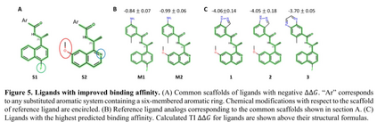 图5展示了两个优化的分子S1和S2,它们的结合亲和力分别提升了-0.84 kcal/mol和-0.99 kcal/mol。在TI ∆∆𝐺为负的配体中,有35个(~26%)分子具有相似的芳香体系。其中9个分子的预测结合亲和力提高了100倍以上。