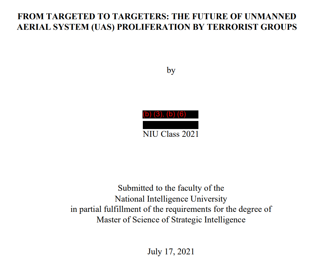 目前的文献认为,恐怖组织未来的无人机系统(UAS)行动威胁有限。本研究的论点恰恰相反。恐怖组织使用无人机系统技术目前只是一种小众威胁。然而,有证据表明,这种威胁将在未来五年内成为主流。本研究采用案例研究法进行定量研究,以证明研究问题。因变量是恐怖分子使用复杂的无人机系统行动。自变量是简单性、供应和规模。研究评估了三个恐怖组织:库尔德工人党、Hayat Tahrir al-Sham 和博科圣地。研究结果表明,获取无人机系统技术很容易,但由于技术限制,扩大行动范围却很困难。此外,报告还指出了当前文献和研究中亟待解决的问题,如组织如何获取上述技术并筹集资金来开发项目。报告还强调了美国和国际社会在应对无人机系统威胁方面取得的进展,同时暴露了立法和法规方面的明显差距。研究的意义表明,美国及其盟国在抵御威胁方面已经落后。