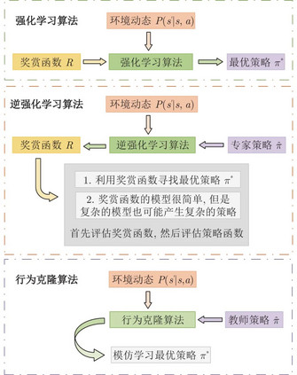 逆强化学习随着人工智能技术的不断成熟表现出强大的发展潜力, 逆强化学习算法的理论和应用领域不断被完善. 从解决问题的方面来看, 可以分为三大分支. 第一个分支是最早的逆强化学习算法, 主要包括2000年斯坦福大学Abbeel等[11]提出的学徒学习逆强化学习(Apprenticeship learning inverse reinforcement learning, ALIRL)、2006年Ratliff等[12]提出的最大边际规划逆强化学习(Maximum margin planning inverse reinforcement learning, MMPIRL)等算法. 然而, 这类算法存在模糊性问题, 即不同的奖励对应相同的策略. 进而衍生出第二个分支, 基于熵的逆强化学习算法, 主要包括2008年卡内基梅隆大学Ziebart等[13]提出的最大熵逆强化学习(Maximum entropy inverse reinforcement learning, MEIRL)、2011年马克斯- 普朗克智能系统研究所Boularias等[14]提出的相对熵逆强化学习(Relative entropy inverse reinforcement learning, REIRL)等. 基于熵的逆强化学习最初实现的是特征到奖励的线性映射, 随着环境复杂度的增大, 2016年牛津大学Wulfmeier等[15]提出深度逆强化学习算法, 借助神经网络能拟合任意非线性函数的能力来学习非线性奖励函数[16-17]. 在专家演示下, 虽然基于熵的逆强化学习算法一定程度上提高了奖励函数的学习精度, 但有限和非最优的专家演示依然影响着奖励函数的学习. 因此, 2016年, 斯坦福大学Ho等[18]给出了生成对抗逆强化学习(Generative adversarial inverse reinforcement learning, GAIRL)的基本定义, 通过RL和IRL的学习迭代不断优化专家演示, 提高奖励的学习精度. 此外, 在复杂的非线性环境下, 2016年斯坦福大学Levine等[19]提出基于高斯过程的逆强化学习(Inverse reinforcement learning with Gaussian processes, GPIRL), 利用高斯函数的高度非线性确定每个特征与策略的相关性, 求解奖励函数. 三个分支既相互独立又相互补充, 基于以上探讨, 如何构建高效可靠的奖励函数和求得最优策略是逆强化学习研究的重点. 在求解的过程中, 针对出现的模糊性和专家演示非最优的问题, 研究者们提出了不同的应对策略, 在一定程度上解决了这些问题. 本文首先介绍逆强化学习算法的发展历程, 然后重点介绍和讨论了逆强化学习算法的应用进展及算法面临的挑战.