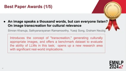 获奖理由:解决了翻译与文化相关的命名实体的挑战,挑战了以前关于如何翻译命名实体的观点。
