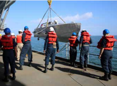 美国海军水手和公务员水手从美国海军 "赫歇尔 "号上发射一个无人水面飞行器(USV)从USNS赫歇尔 伍迪-威廉姆斯,2019年9月14日。