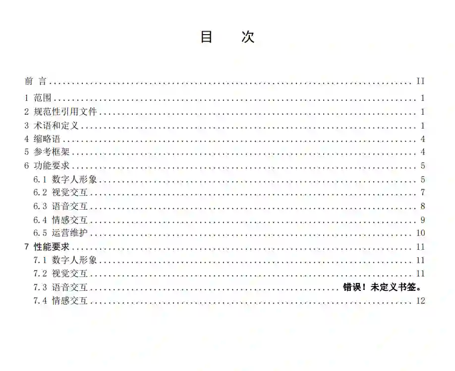 本文件规定了客服型虚拟数字人参考框架、功能要求和性能要求。本文件适用于指导客服型虚拟数字人的设计、开发、测试、应用、管理等。随着人工智能、虚拟现实、高精度渲染等技术的发展和融合,数字人的拟人化程度愈来愈高,已经逐渐走向大众视野,出现在日常生活中。其中,作为数字人的典型应用,客服型虚拟数字人旨在通过智能化的交互服务,快速高效地处理客户的各种需求,提供个性化的服务,为用户节省时间和精力。目前,客服型虚拟数字人已经在金融、导览、文旅、政务、咨询、营销、企业服务、电子商务等领域取得广泛应用,并具有规模化和可复制化的商业价值,已经在部分领域为人们的工作、生活提供了巨大的便利。 当前客服型虚拟数字人正处在快速发展和迭代的时期,各厂商正在积极布局和推广。但是由于行业内还没有针对客服型虚拟数字人明确的功能和性能要求的相关标准,行业内对于数字人尚未形成比较广泛的共识,导致客服型虚拟数字人产品体验和服务能力层次不齐,市场对于数字人产品的理解和接受程度也大相径庭。 因此,有必要针对客服型虚拟数字人,基于现有产品充分调研和比较的基础上,结合对技术发展、市场需求以及行业趋势的把握,从通用意义上给出当前客服型虚拟数字人产品明确的基础的功能要求和具体的性能指标要求,制定此标准。