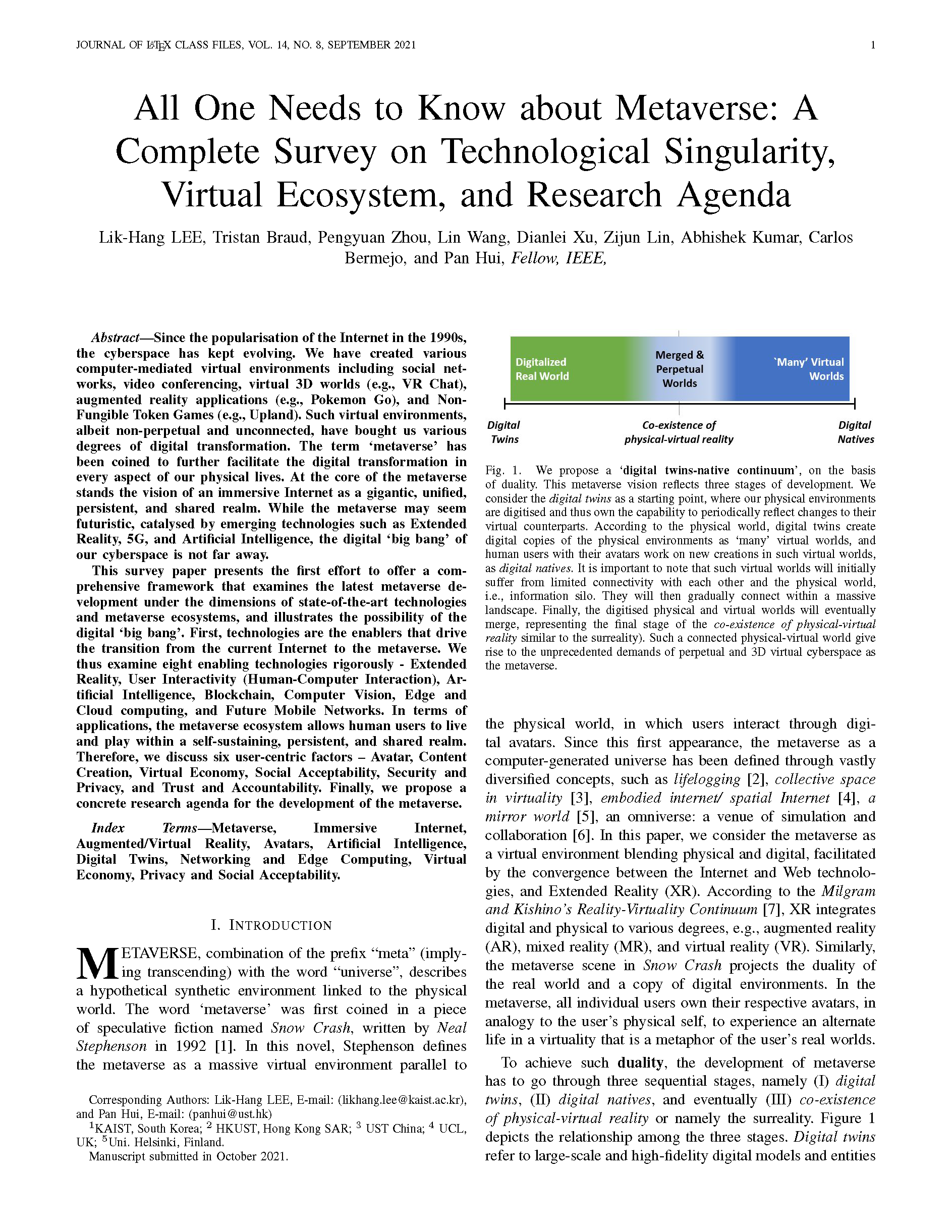 韩国先进科学技术研究所、香港科技大学AR/VR顶级专家,发表元宇宙(技术、虚拟生态系统、研究进程)综述论文(66页pdf、149页PPT)。