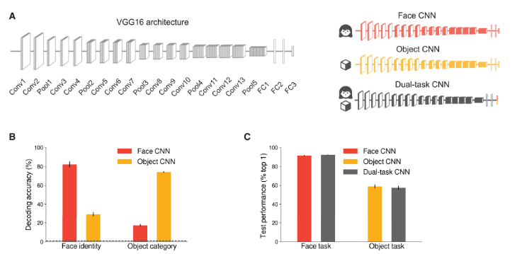 图1:单独训练的 CNN 中的人脸和物体表现不同,而双任务 CNN 表现良好。(A) 优化了三个具有 VGG16 架构的网络(左),一个用于人脸识别分类(红色的人脸 CNN),一个用于物体分类(物体CNN 为橙色),一个同时处理两个任务(双任务 CNN 为灰色)。(B) 使用从 Face CNN 和 Object CNN 的倒数第二层 [即 (A) 中的 FC2] 提取的激活模式,对保留的人脸识别和保留的物体类别进行解码的准确性。Face CNN 在人脸解码方面优于 Object CNN,在物体解码方面反之亦然。因此,为每个任务优化的表示并不自然地支持另一个。灰色虚线表示机会水平 (1%)。误差线表示跨分类折叠的 SEM。(C) 双任务 CNN 对执行的任务和单一网络进行了优化。误差线表示跨类和刺激自举的 95% 置信区间 (CI)。