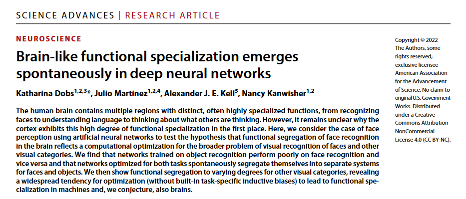 人类大脑包含多个区域,它们具有不同的、通常高度专门化的功能,从识别人脸到理解语言,再到思考别人在想什么。然而,目前还不清楚为什么大脑皮层首先表现出这种高度的专门化功能。在这里,我们考虑使用人工神经网络,以人脸感知为例,来测试大脑中人脸识别的功能分离,反映了对人脸和其他视觉类别更广泛的视觉识别问题的计算优化假设。我们发现,经过物体识别训练的网络在人脸识别上表现得很差,反之亦然,而在这两项任务上都得到优化的网络会自发地将自己划分为人脸和物体的独立系统。然后,我们展示了其他视觉类别在不同程度上的功能隔离,揭示了一种普遍的优化趋势(没有内置的特定任务的归纳偏见),从而导致机器(我们推测也包括大脑)的功能专业化。