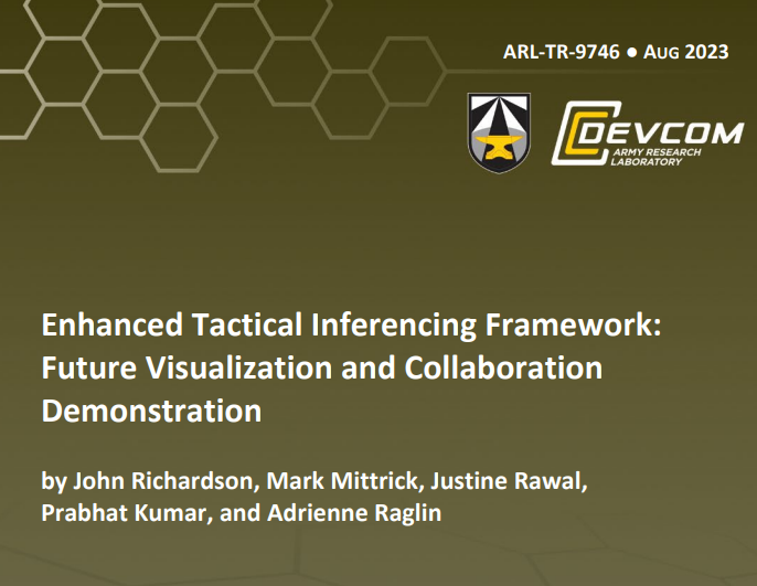 本报告介绍了美国陆军研究实验室内容理解处的研究人员在 2023 财年为采用增强型战术推理(ETI)框架所做的工作。ETI 的开发旨在支持多智能体环境(数据源智能体、推理模型智能体和决策者智能体)中人工推理研究的实验和演示。在本报告中,ETI 被用于在跨现实环境中演示基于不确定性的决策推荐功能。从模拟场景的数据开始,再加上额外的外部环境,ETI 智能体对态势感知信息中的不确定性进行推理,为决策者提供建议选择。最后,ETI 的产品被转化为跨现实可视化,以探索新的人机交互模式。