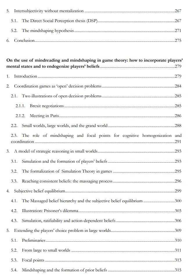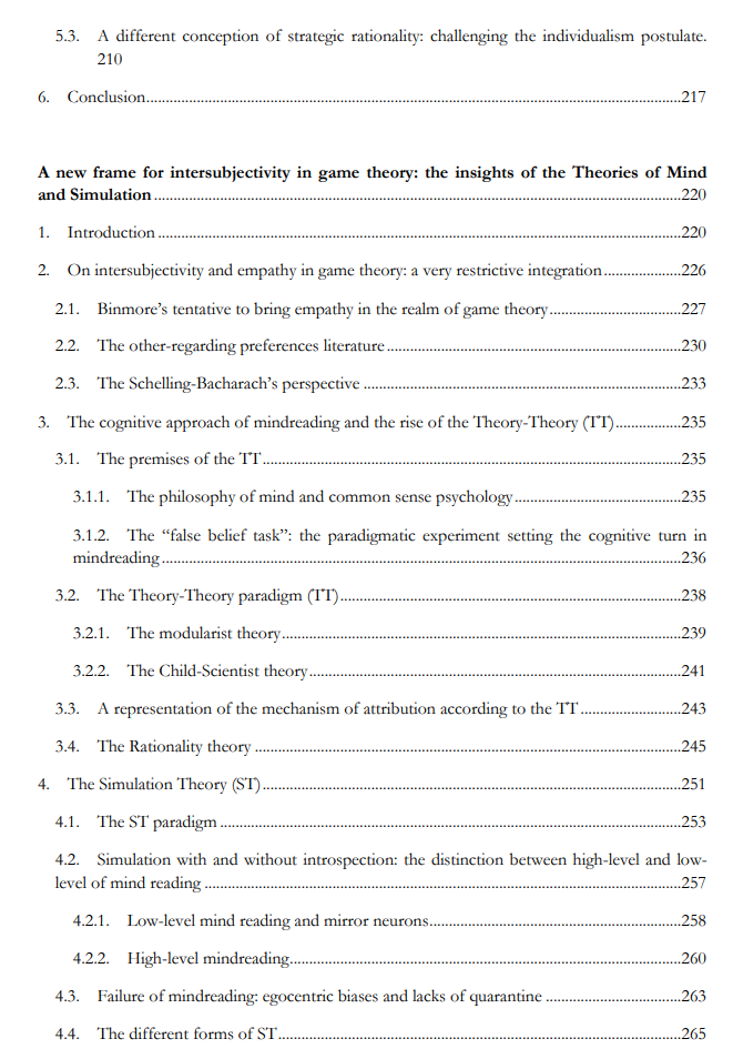 本文提出改变博弈论的本体论和方法论,将博弈定义为对参与者战略推理过程的理解。我们的贡献是基于一种跨学科的方法来重新评估战略推理中涉及的主体间类型。我们认为博弈分析必须涉及对引导参与者找到特定解决方案的推理过程的研究和确定。不应像在标准博弈论中那样将博弈理解为均衡时个人选择的数学表示。这需要调查参与者的协调能力。我们声称理解协调过程有助于理解参与者的战略推理。这使得为博弈论中的不确定性问题提供新的答案成为可能,这构成了博弈论面临的僵局之一,并强调了其积极和规范的困难。该论文基于这样一个论点,即理解参与者在博弈中的推理过程首先需要解释参与者如何形成他们对其他参与者选择的信念、他们的感知和他们的信念,以及他们的推理方式。本论文的目标之一是表明解释参与者信念形成的心理学理论对于解释协调是必要的,并且心理理论(ToM)提供了一个充分的心理框架。我们建议构建一个基于模拟理论的替代博弈论作为心理理论。当参与者模拟他人的推理时,我们定义了博弈中理性选择的公理化特征。