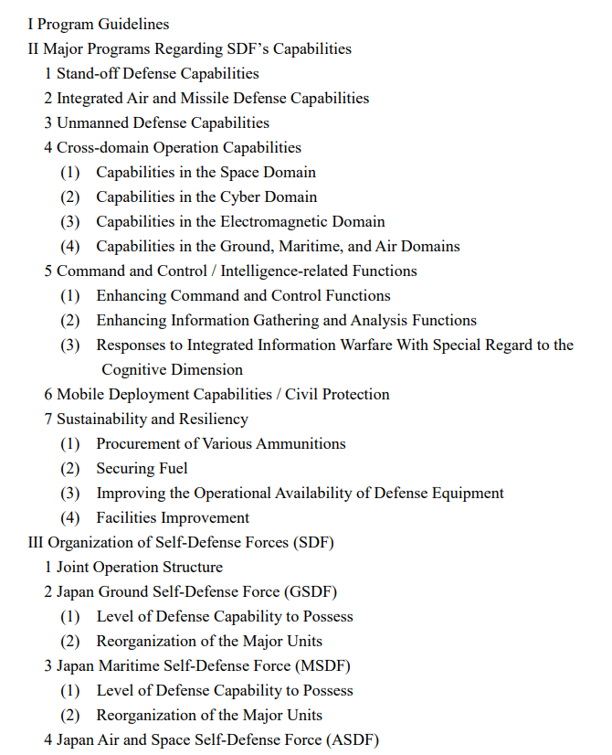 鉴于上述指导思想,日本防卫省/自卫队(以下简称 “MOD/SDF”)将根据以下计划方针,建设、维护和运用防卫能力。