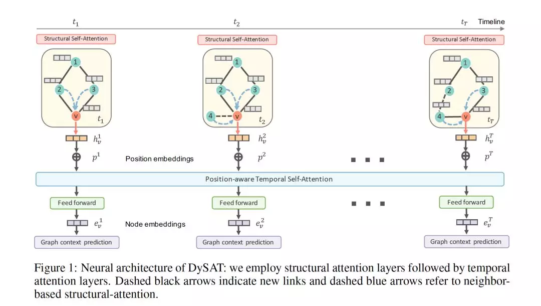 摘要:学习图中节点的潜在表示是一项重要且普遍存在的任务,在链接预测、节点分类和图可视化等领域有着广泛的应用。以往的图表示学习方法主要集中在静态图上,而现实世界中的很多图都是动态的、随时间变化的。在这篇论文中,我们提出了Dynamic Self-Attention Network (DySAT),这是一种新型的神经架构,它操作在动态图上,并学习节点表示,以捕捉结构特性和时间演化模式。具体来说,DySAT通过在两个维度(结构邻域和时间动态)上联合使用self-attention层来计算节点表示。我们对两类图进行了链接预测实验:通信网络和二分评级网络。我们的实验结果表明,DySAT在几种不同的最先进的图嵌入baseline上有显著的性能提升。