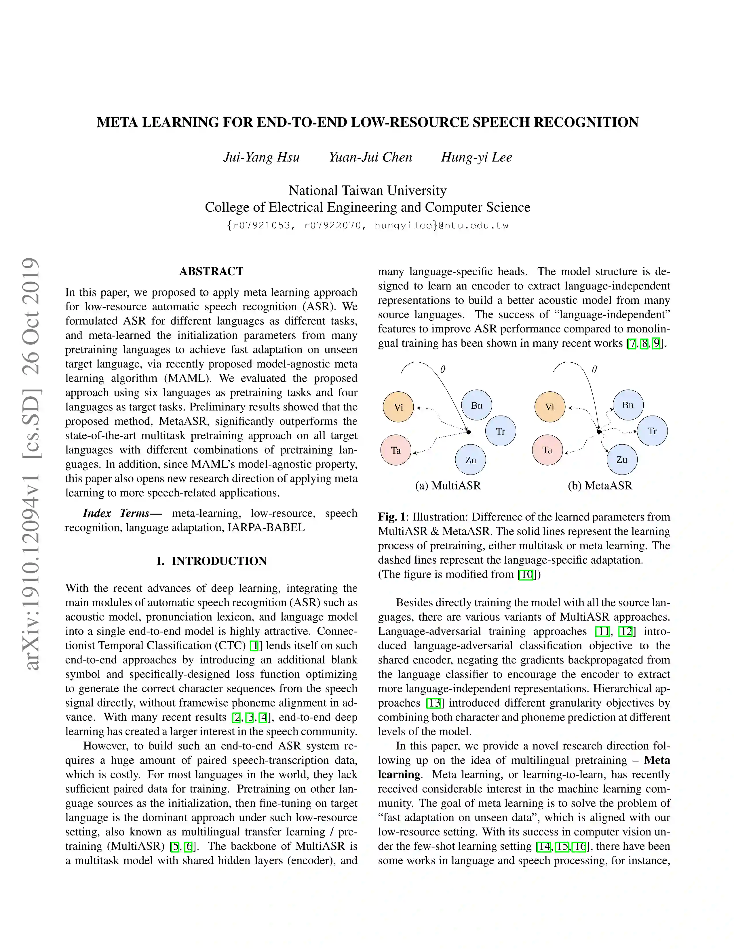 论文题目: Meta Learning for End-to-End Low-Resource Speech Recognition
